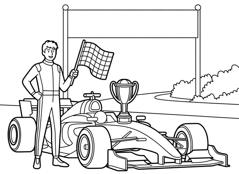 O piloto para na linha de chegada após uma grande vitória. Ele está orgulhoso ao lado de seu carro de corrida.