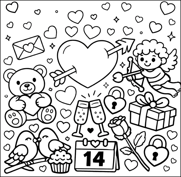 無数のハートが喜びの旋風のように舞い上がります。 それぞれのハートは、多様な模様を通して異なる物語を語ります。 形は決して融合することなく、近づいていきます。 視線は次々とデザインへと自由に移動していきます。 全体が優しく遊び心のある雰囲気を醸し出します。 バレンタインデーの雰囲気が、豊かさと遊び心を通して表現されています。