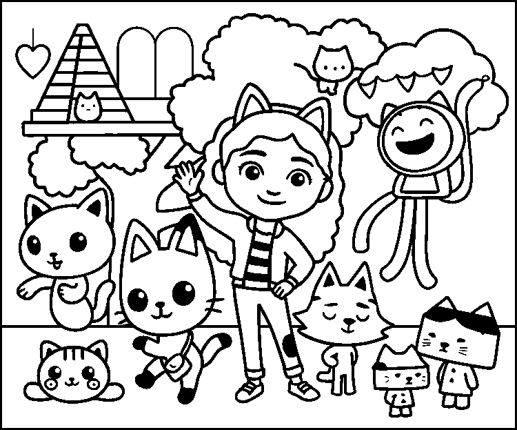 Персонажи Кукольный домик словоохотливый ( Кукольный домик Габби) это: Габби, Панди Лапы, Китти Фея, Мама Бокс, Кошачья крыса, Кейти, Бэби Бокс, MerCat, Кот-подушка, DJ Catnip и Карлита.