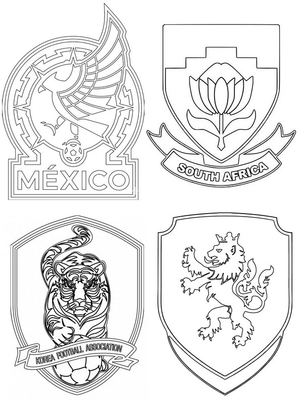 Grupa A: Meksyk, Republika Południowej Afryki, Korea Południowa i Czechy. Ta strona prezentuje cztery kultowe herby, z których każdy opowiada historię narodu pasjonującego się piłką nożną. W lewym górnym rogu meksykański orzeł dumnie rozpościera skrzydła nad piłką. Obok niego, elegancka lilia RPA wkomponowana jest w prostą i harmonijną tarczę. Poniżej, południowokoreański tygrys zdaje się wyskakiwać z kadru, gotowy do ryku wbiegnięcia na boisko. Po prawej stronie, czeski lew heraldyczny stoi dostojnie w majestatycznej pozie. Razem tworzą dynamiczną scenę, w której każdy symbol czeka na żywe kolory, które go ożywią.