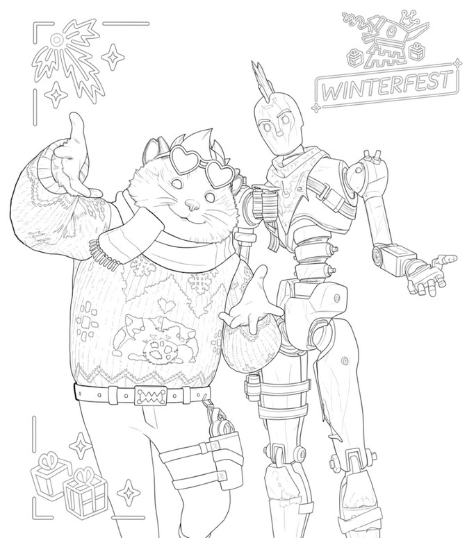 Esta página para colorir exclusiva celebra o evento Winterfest 2025 do Fortnite com personagens icônicos da temporada. Em primeiro plano, você pode colorir a skin gratuita Cheeks, um adorável hamster usando um suéter natalino detalhado e óculos em formato de coração. Ao lado dele, está um misterioso autômato metálico com reflexos gélidos, perfeito para brincar com tons de azul e cinza. O fundo exibe com orgulho o logotipo do Winterfest cercado por motivos festivos, como flocos de neve e presentes esperando para serem desembrulhados. Crianças e fãs do jogo vão adorar personalizar o design do suéter, que retrata dois hamsters compartilhando um biscoito. Na parte superior da imagem, folhagens e estrelas brilhantes completam esta aconchegante cena de inverno. Este desenho para imprimir captura a atmosfera das missões de fim de ano e da famosa cabana de inverno. O autômato tem muitas articulações mecânicas, oferecendo um desafio interessante para quem gosta de detalhes minuciosos. Você pode usar marcadores vermelhos e verdes para a roupa do Cheeks, combinando com as cores tradicionais do feriado. Não se esqueça de colorir os pequenos ícones na parte inferior da página, como a fogueira e as típicas caixas surpresa da ilha. Esta atividade criativa é perfeita para se manter ocupado entre os jogos durante as férias de Natal de 2025. Baixe este arquivo de alta definição para obter um contorno nítido e fácil de preencher, mesmo para jogadores mais jovens. É a oportunidade perfeita para dar vida às suas skins favoritas enquanto desenvolve seu próprio estilo artístico.