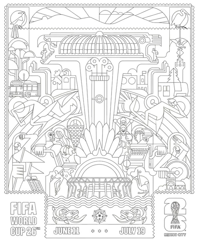 Diese Ausmalseite zeigt das Poster für Mexiko-Stadt zur Fußball-Weltmeisterschaft 2026. Sie präsentiert eine Komposition voller mexikanischer Kultursymbole. Das zentrale Gebäude dominiert mit seiner imposanten Architektur. Zahlreiche Figuren und folkloristische Elemente erwecken die Zeichnung zum Leben. Die geometrischen Linien spiegeln den unverwechselbaren Kunststil der Stadt wider. Fische, Muster und Verzierungen unterstreichen die visuelle Identität von Mexiko-Stadt. Die Ausmalseite bietet viele Flächen zum Ausmalen und ermöglicht so ein detailreiches Ergebnis. Sie eignet sich für Kinder und Erwachsene, die gerne malen. Der Bezug zur Weltmeisterschaft ist dank Logo und Datum deutlich erkennbar. Diese Aktivität verbindet kulturelle Entdeckung mit kreativem Vergnügen. Die Datei ist für einen gestochen scharfen Druck optimiert. Der Text unterstützt die Suchmaschinenoptimierung (SEO) durch die Verwendung von Schlüsselwörtern zu Mexiko-Stadt, Fußball und der WM 2026.